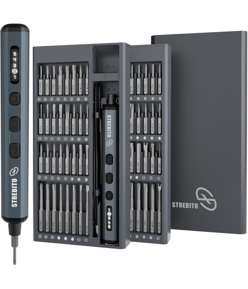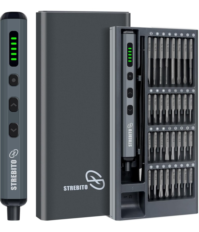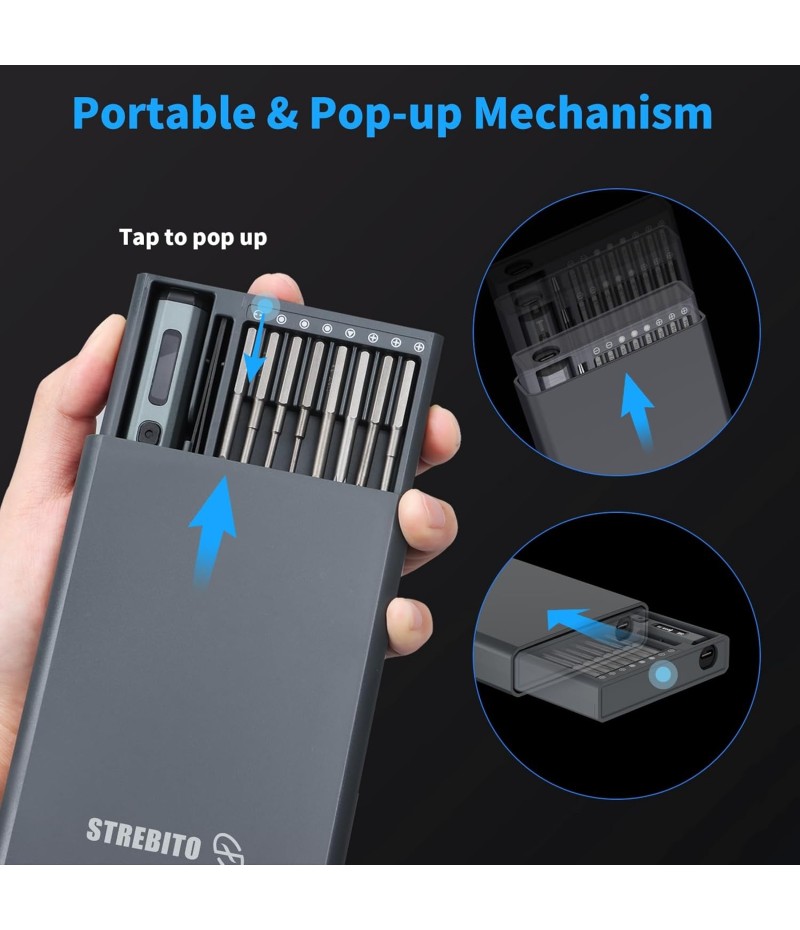 • 【Lifetime Warranty】Comes with a magnetic case to keep each part orderly in place. This electric screw driver features one-click pop-up mechanism and compact size for convenient storage or transportation. Every driver bit is made of high-quality S2 steel with a hardness of up to 60HRC. This electric screwdriver set is covered by STREBITO's lifetime warranty and a 30-day money-back guarantee. If you encounter any issues with your cordless screwdriver, simply contact customer service for help