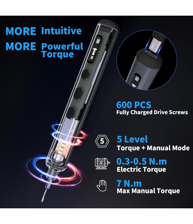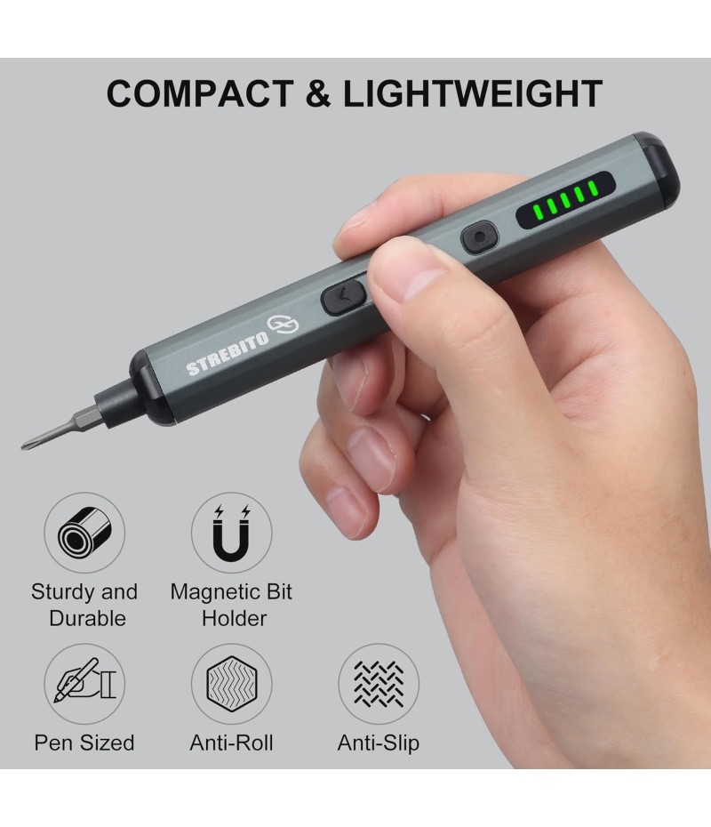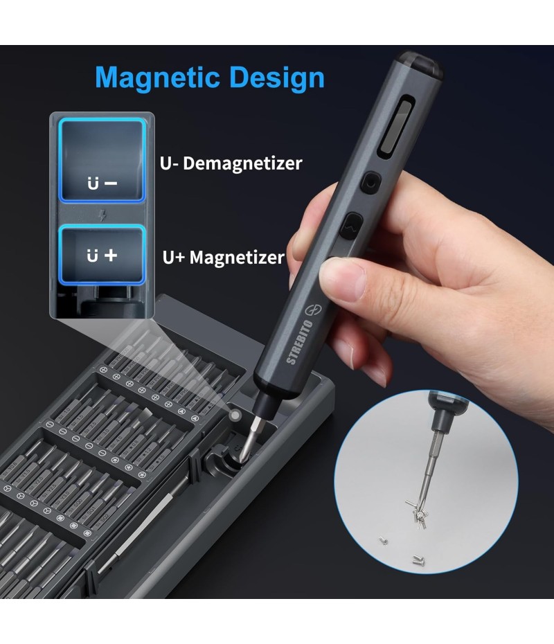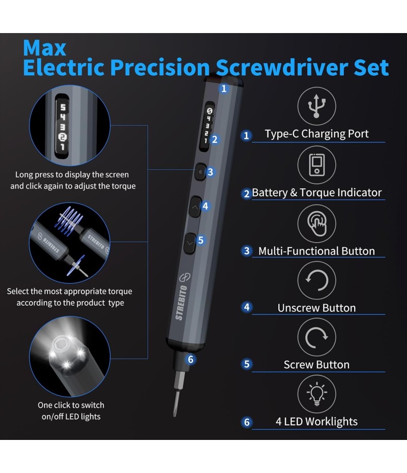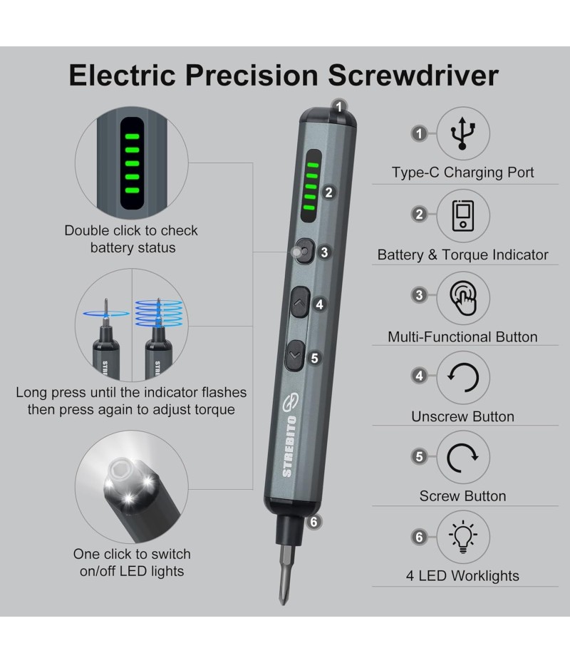 • 【5 Torque Settings】The STREBITO electric precision screwdriver features 5 gear torques ranging from 0.15-0.35N.m, allowing you to adjust the torque precisely to meet various needs. The manual torque of 7N.m gives you increased control for manual screwdriving. With easy torque adjustment and stable torque output, this precision electric screwdriver can satisfy all your demands, includes PC, Computer, Laptop, Cell Phone, Macbook, RC Car, Drone, Keyboard, PS4, PS5, and other electronic devices