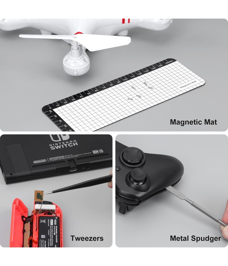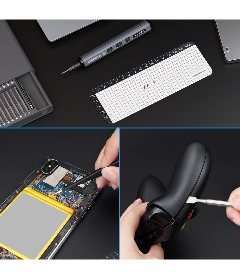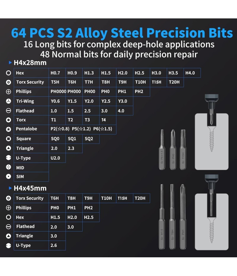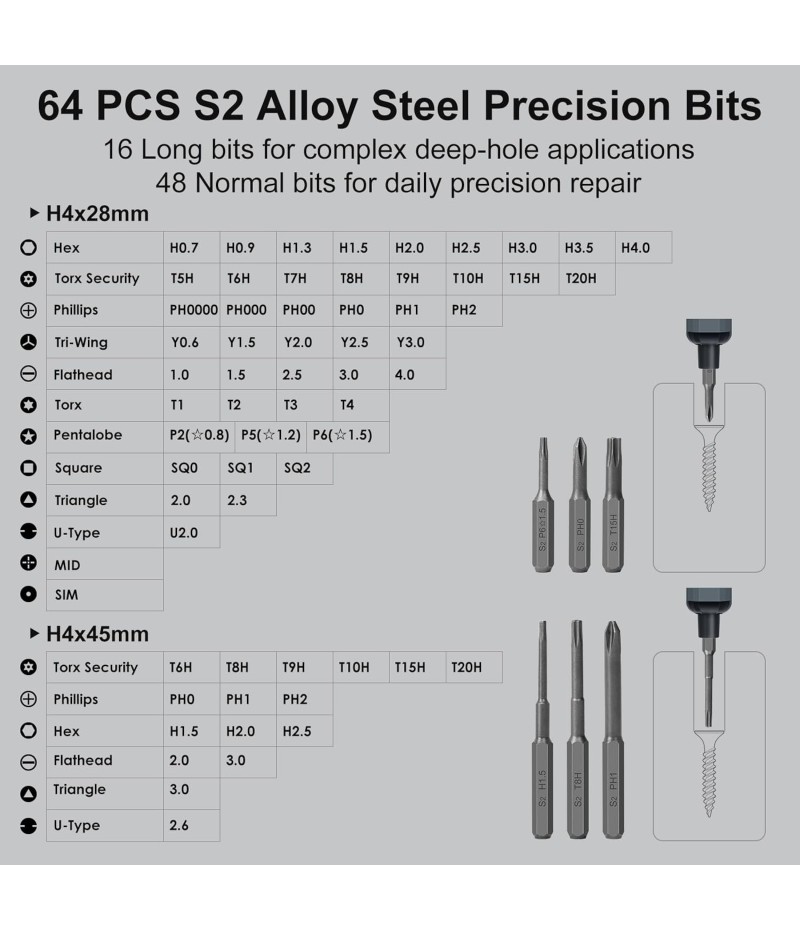 • 【Wide Application】Equipped 64 precision bits - Phillips, Torx, Flat Head, Triwing, Hex, Pentalobe, Triangle, etc, This electric screwdriver kit has everything the professional needs. It features 16 long bits for complex deep-hole applications. The integrated magnetizer provides immediate magnetization for screwdriver tips, while the Magnetic Mat is great for keeping track of tiny screws. The Metal Spudger helps pry and poke, and the tweezers are ideal for working with micro electronics