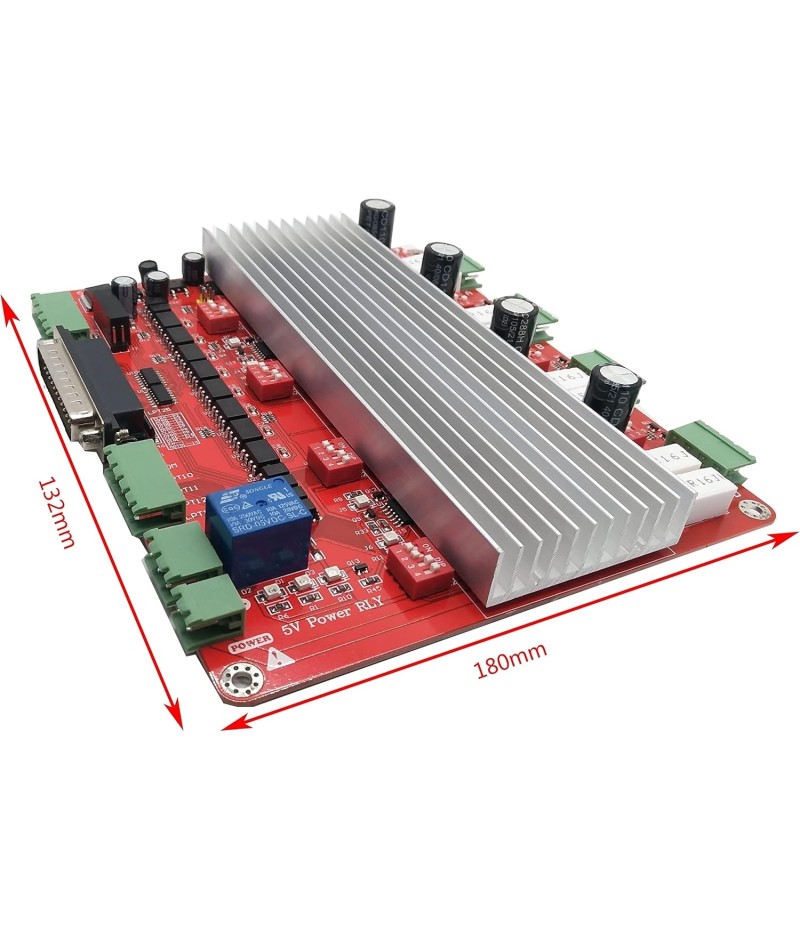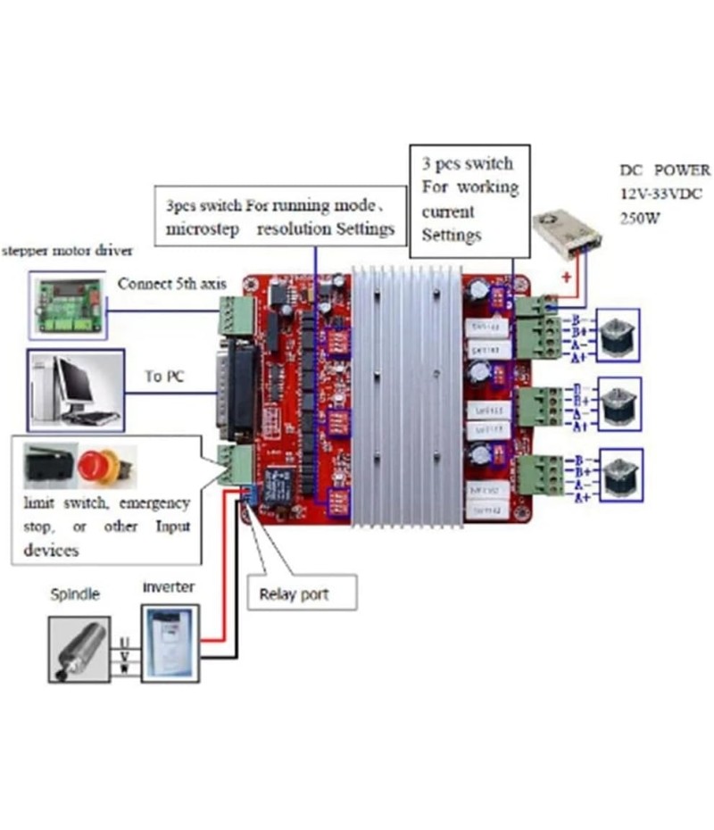 1. An overview of the Tb6560-v2 three-axis stepper motor driver, using high-performance dedicated microstep control chip TB6560, The open type microcomputer can design the control function into the driver board according to the user's request and constitute the minimum control system. The control panel is suitable for driving any small or medium sized two-phase or four-phase hybrid stepping motor.New bipolar Constant current chopper technology makes the motor run with high precision, small vibration, low noise, smooth operation, safe and convenient, is vast 2, the characteristics of 1) new bipolar constant current chopper technology 2) interface with limit 3) spindle relay output 4) with automatic half-flow function 5) input pulse frequency up to 15KHZ 6) four subdivision options are supported: 1, 1/2, 1/8 and 1/16 7) with ordinary photoelectric coupler 8) with adjustable current of 0.7a, 1.75a, 2.6a and 3.5a (peak) 9) standard parallel port interface, supporting MACH2, , KCAM4 series of soft 3. Application field The tb6560-v2 triaxial stepper motor driver combined with the is a new generation set for engraving and milling As one of the multi-functional carving system.The system is mainly applicable to the following fields: * used for processing various patterns and colorful molds, such as: embossing board, sole mold, button mold, pull Chain mold, pattern and text impression and bronzing mold, instrument mold, glass mold, etc. * for advertising industry, such as company signs, signage, architectural models, badges, badges, insignia boards, exhibition boards, etc. Logo, door plate, signage, craft decoration, furniture decoration, etc.