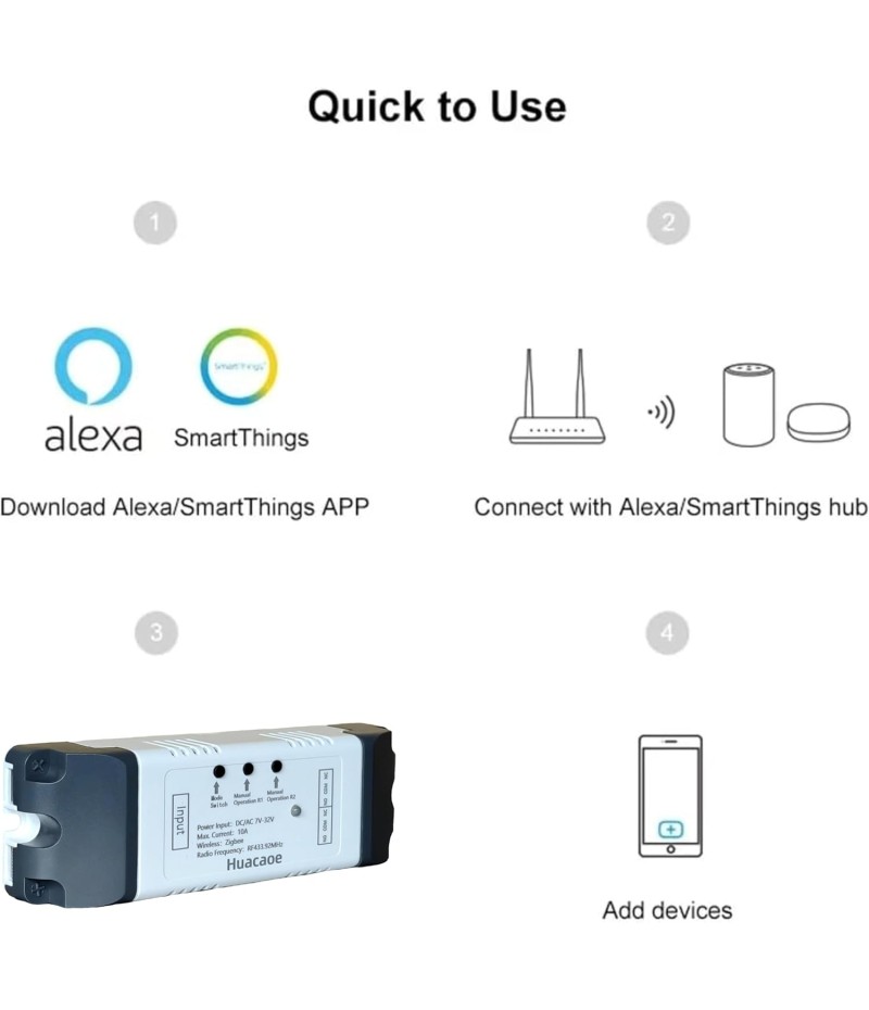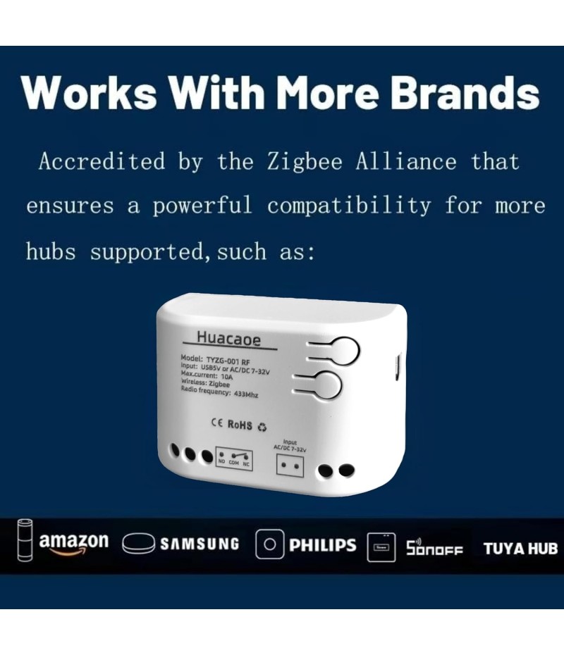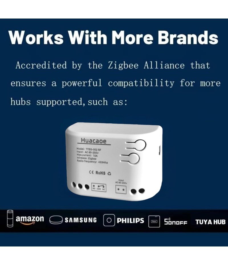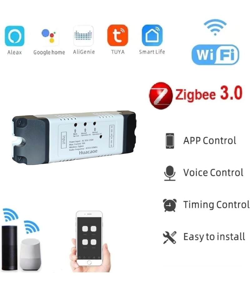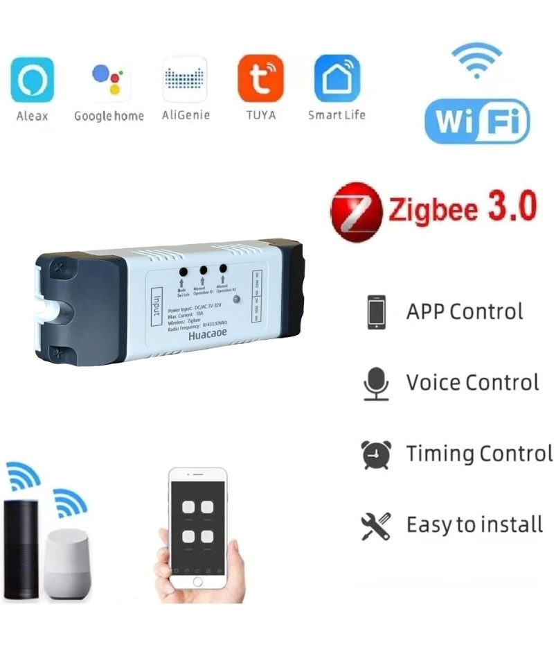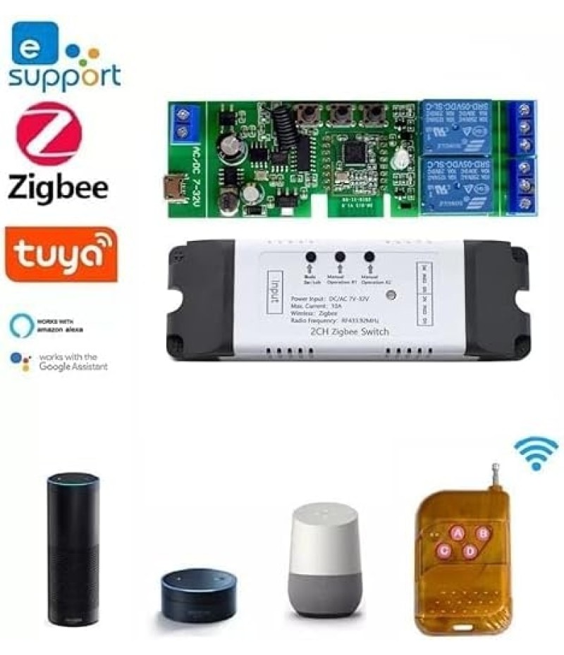 - 2 Channel Smart Wireless Zigbee Relay Switch,work with ewelink zigbee Bridge,tuya zigbee hub.Easy set up,work with Tuya Smart life Zigbee Gateway hub.Once configured with tuya app,then link to alexa app,then you can voice control each channel.If it's connected to alexa app directly through echo device with zigbee hub,it will be discovered as 1 channel only.