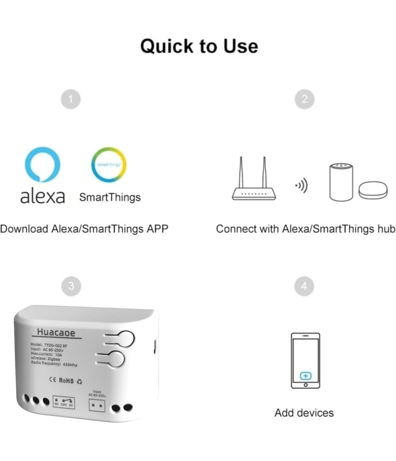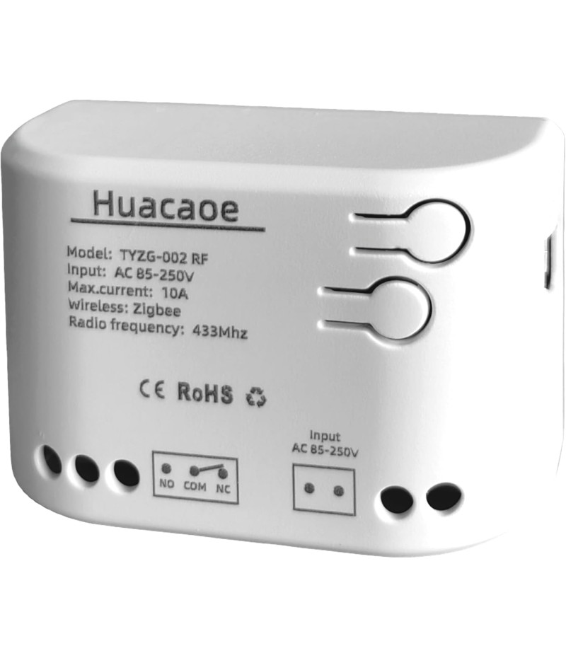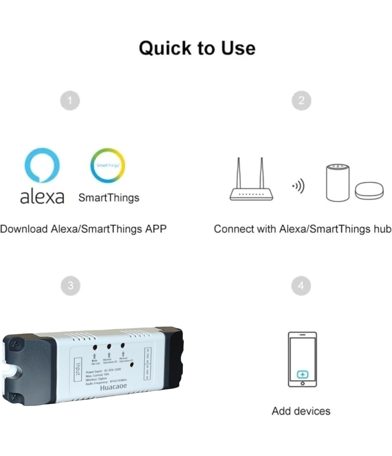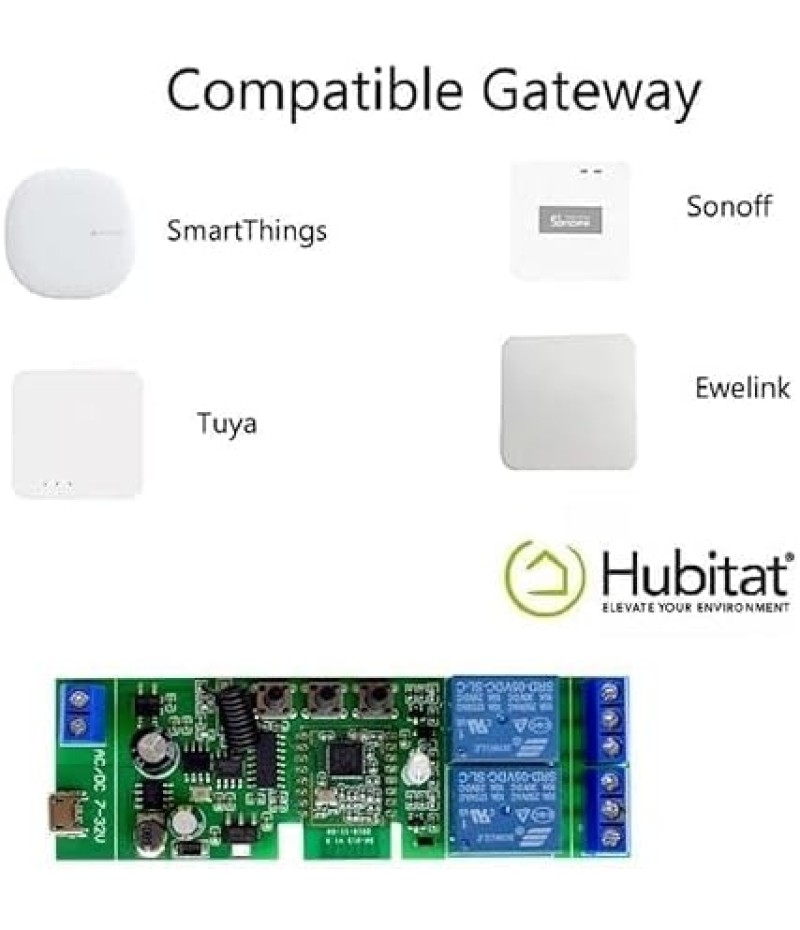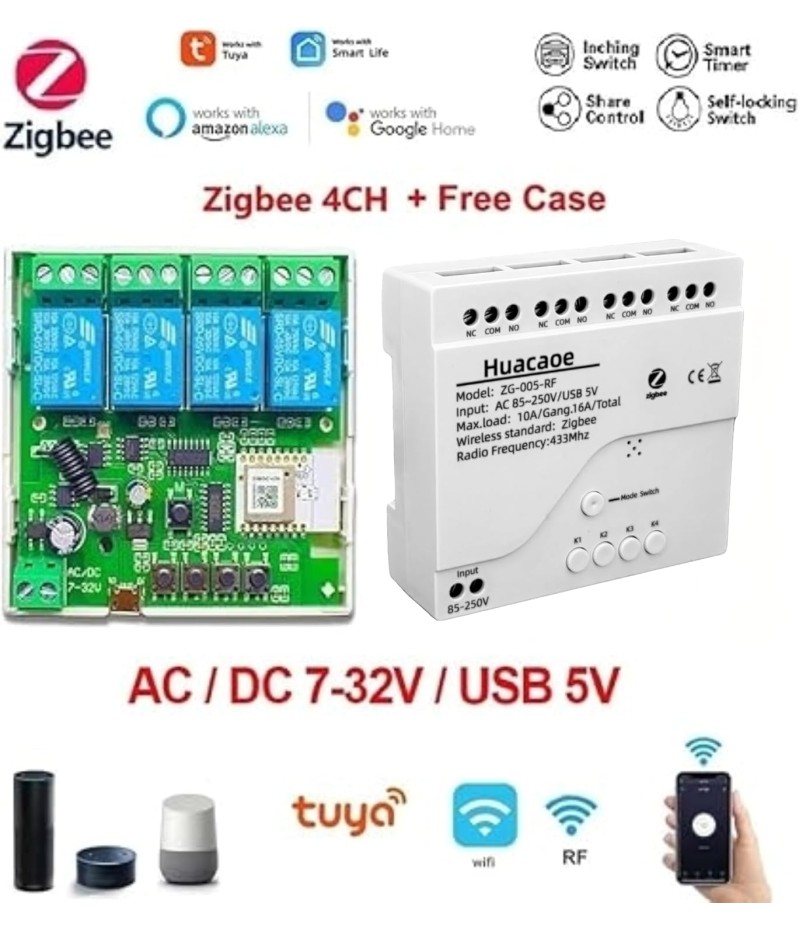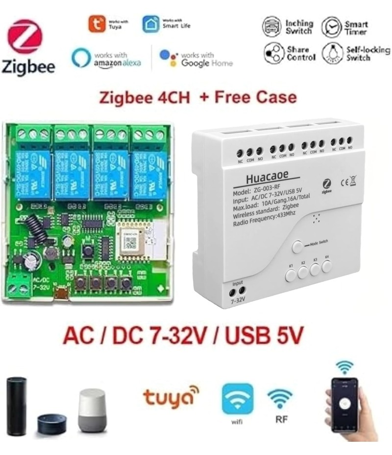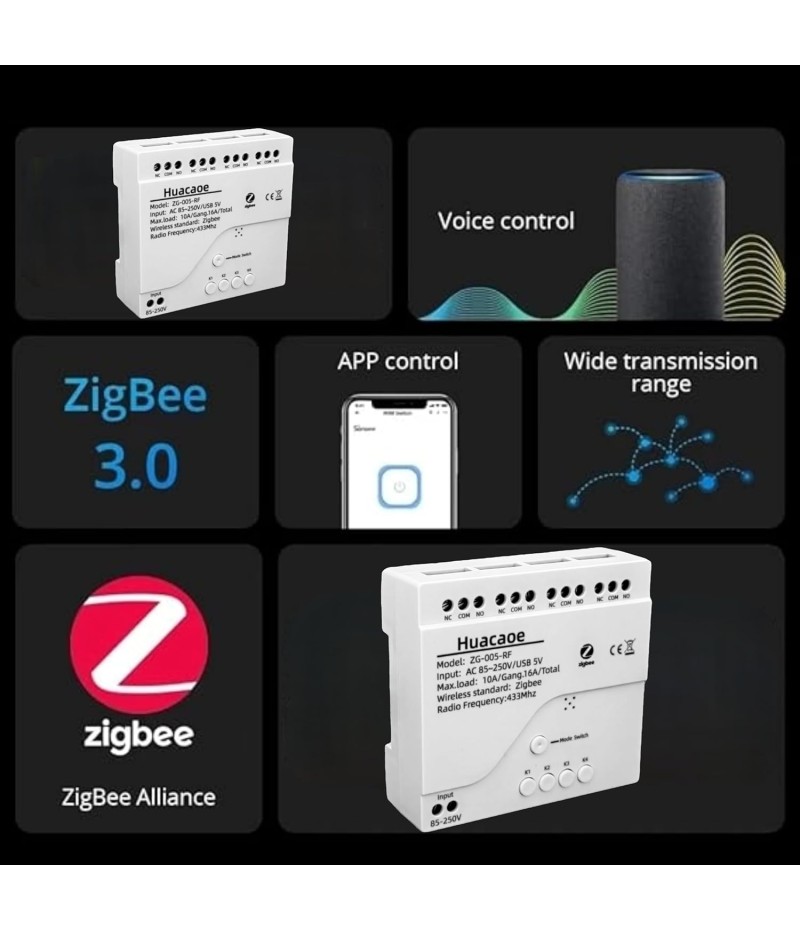 - 2 Channel Smart Wireless Zigbee Relay Switch,work with ewelink zigbee Bridge,tuya zigbee hub.Easy set up,work with Tuya Smart life Zigbee Gateway hub.Once configured with tuya app,then link to alexa app,then you can voice control each channel.If it's connected to alexa app directly through echo device with zigbee hub,it will be discovered as 1 channel only.