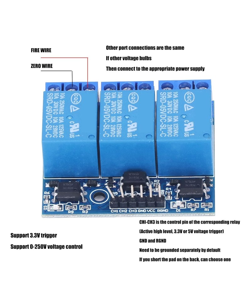 2. 5V is the negative and positive pole of the 5V power supply of the relay, CH1, CH2, CH3 are the control ports,