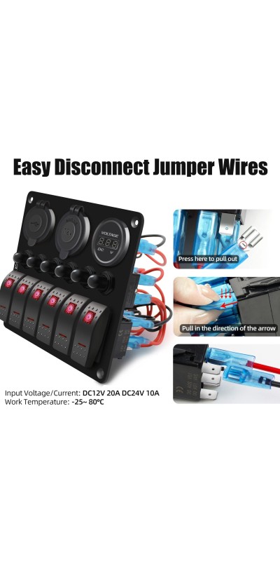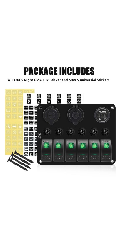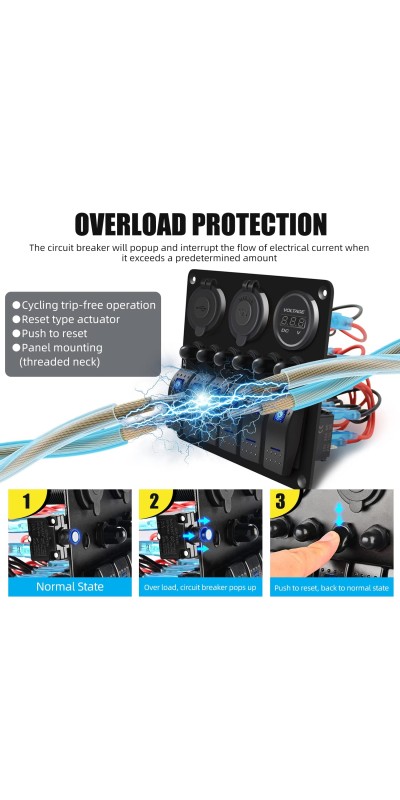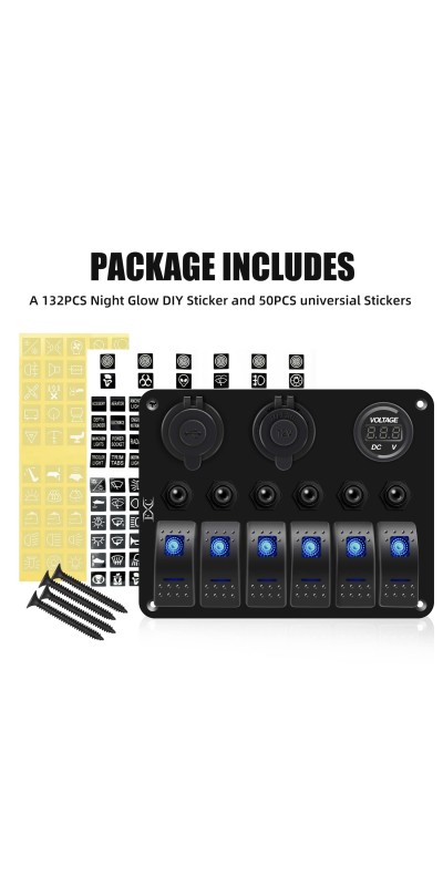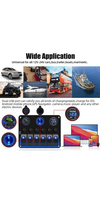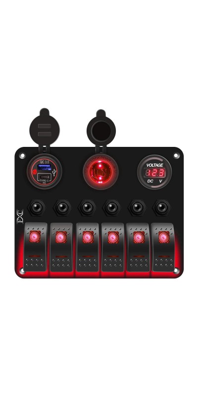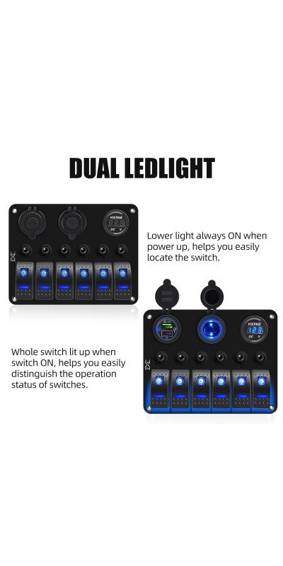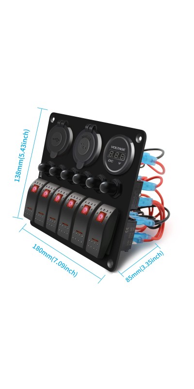 Waterproof Marine Boat Blue Rocker Switch Panel 6 Gang with USB & Type-C Charger Slot Socket + Cigarette Lighter +LED Voltmeter with Overload Protection Circuit Breaker for Car Rv Vehicles Truck