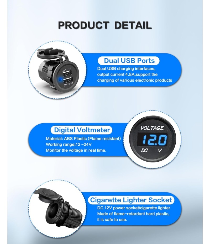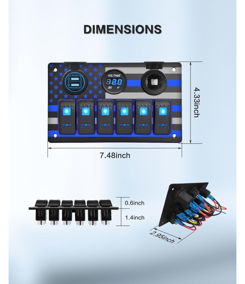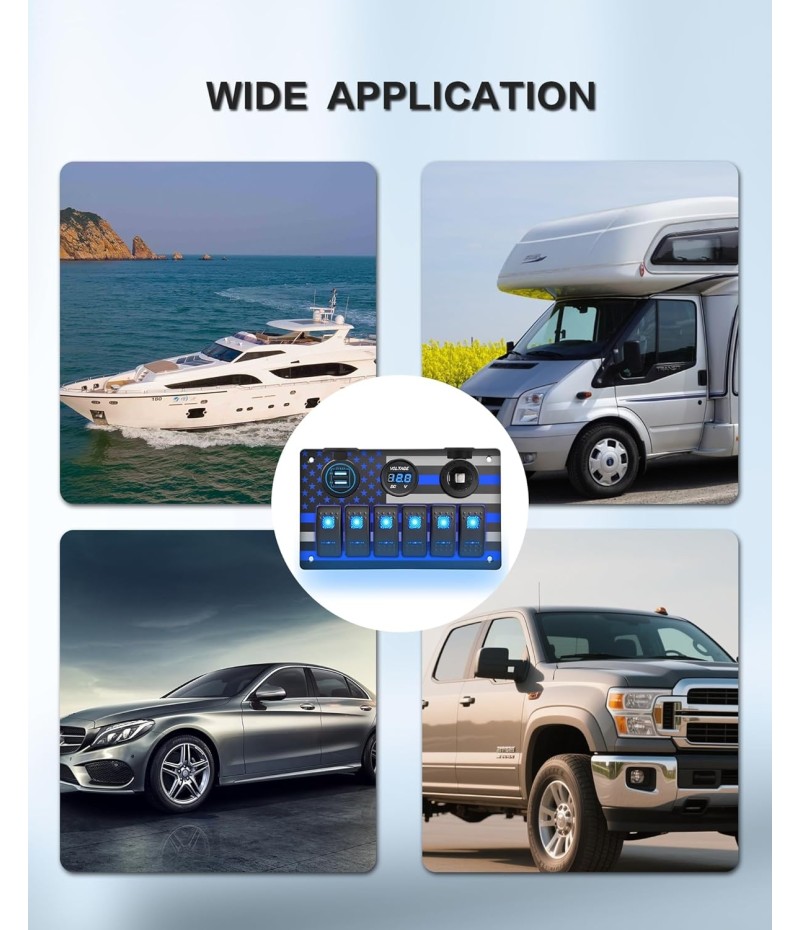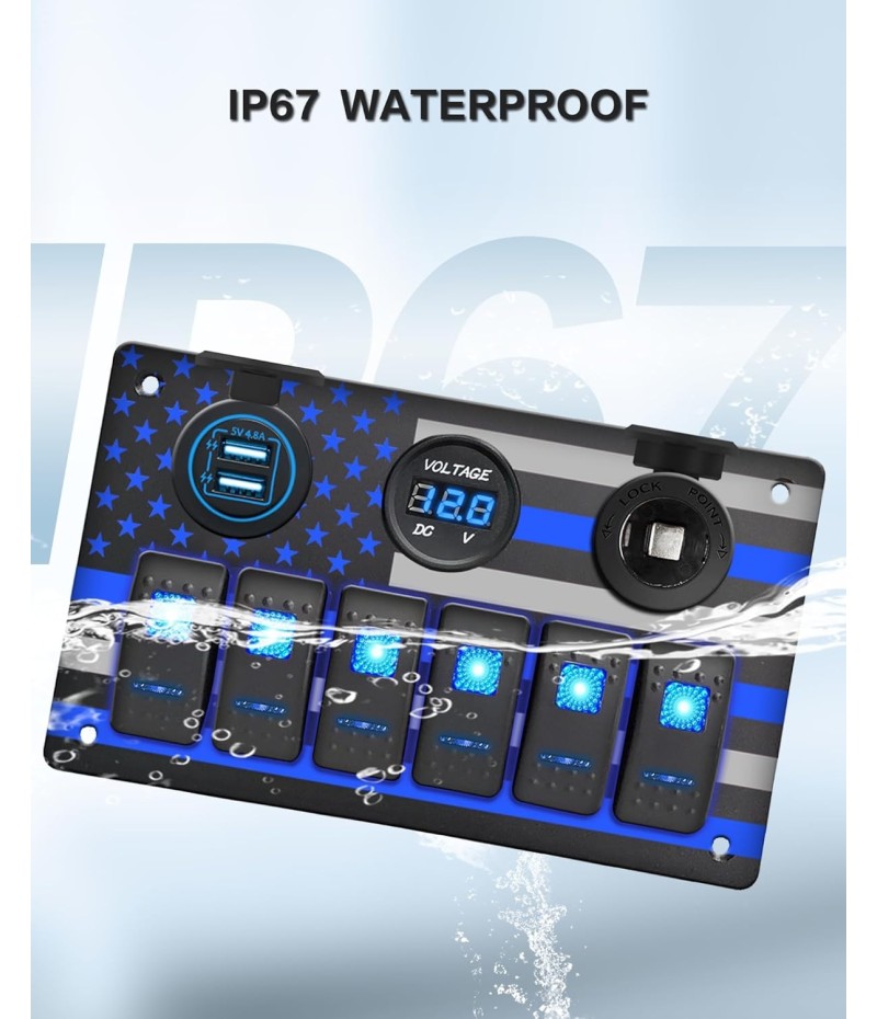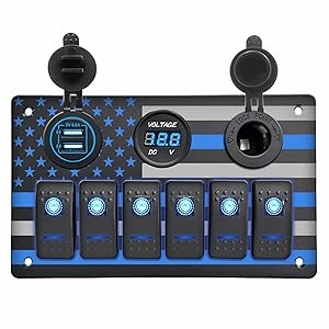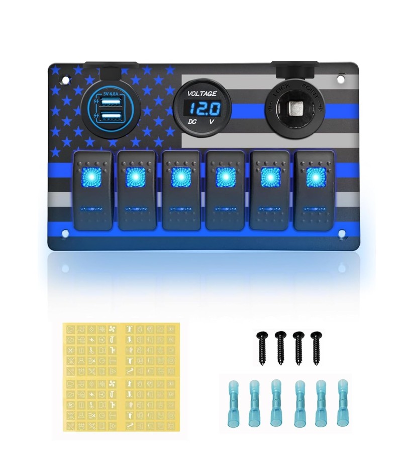 - 【All-in-One Boat Switch Panel】Dual Fast USB Chargers (5V/4.8A) + Digital Voltmeter + 12V Power Outlet + 6-Gang Waterproof Rocker Switch Panel. Perfect for marine circuit control, charging devices, and voltage monitoring on boats, yachts, or trucks.