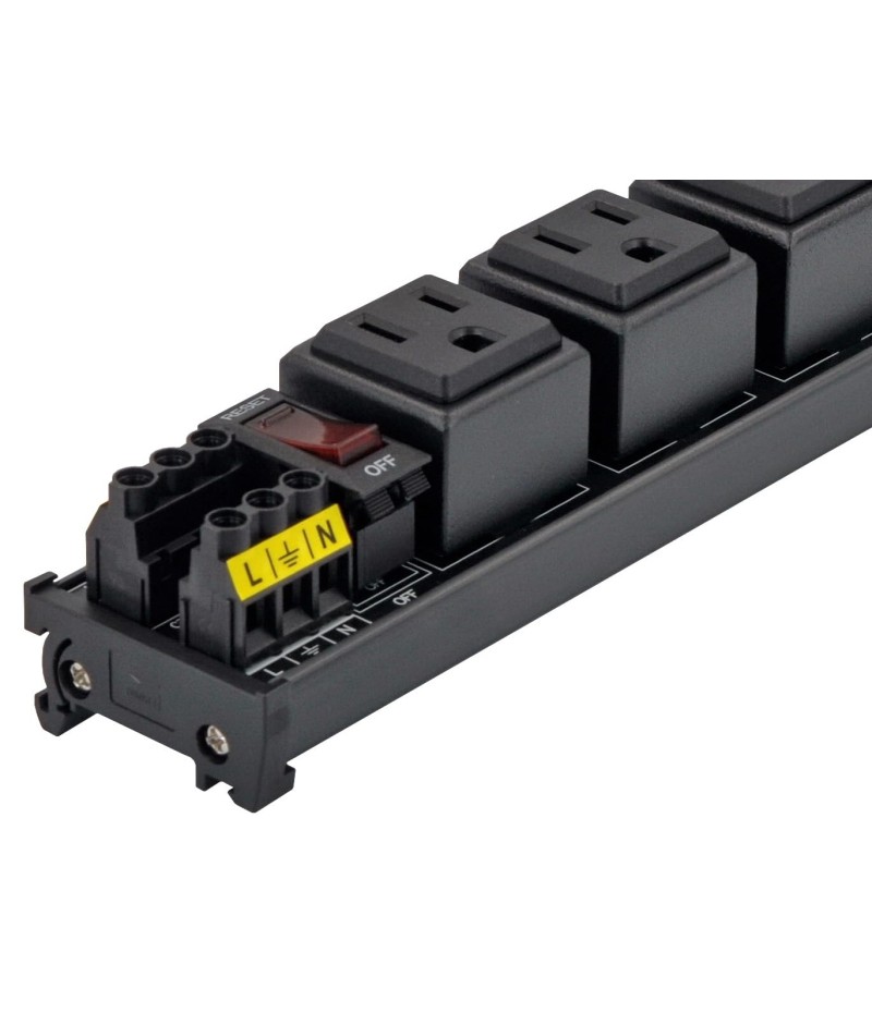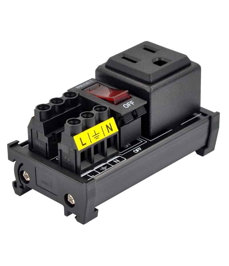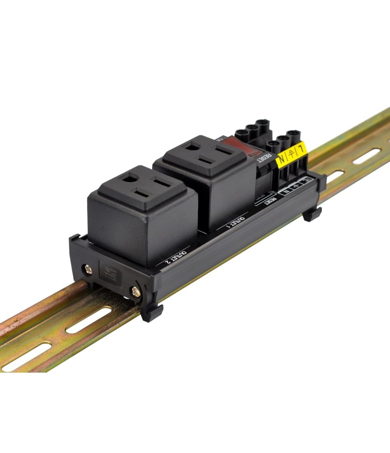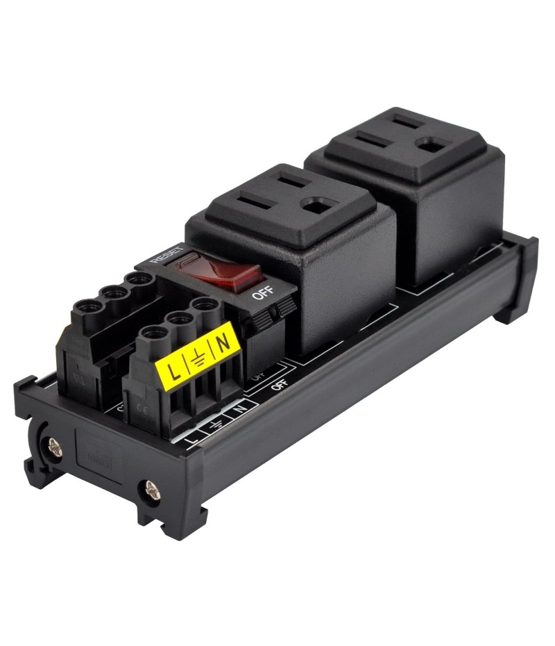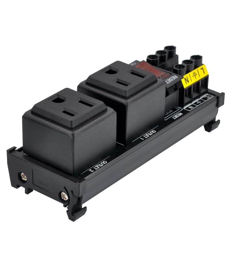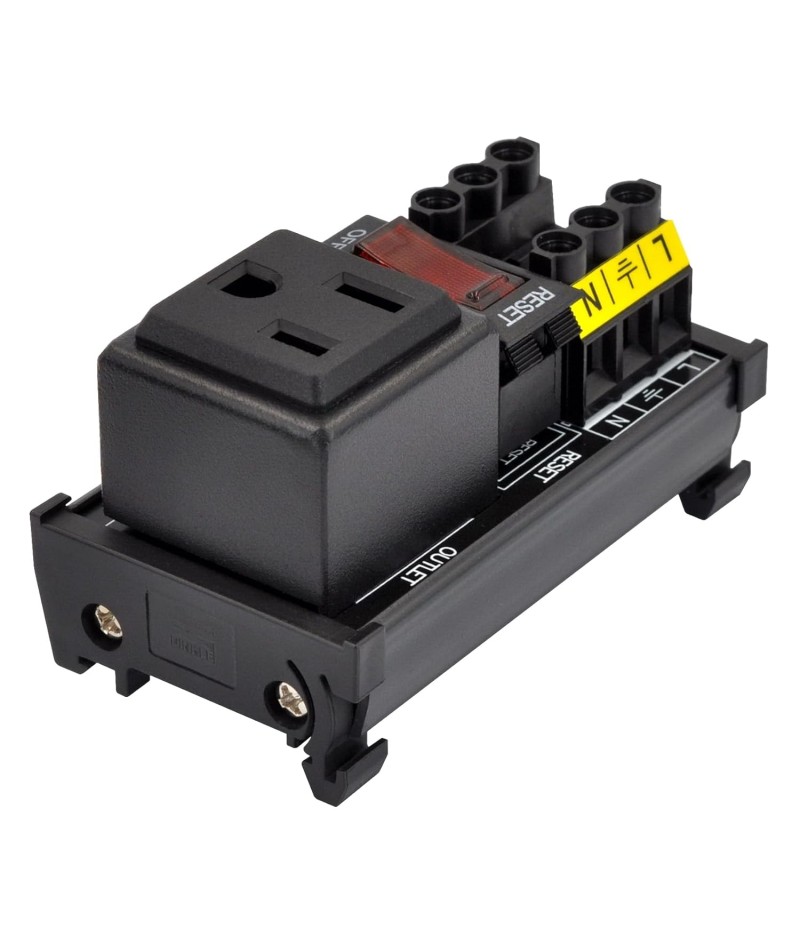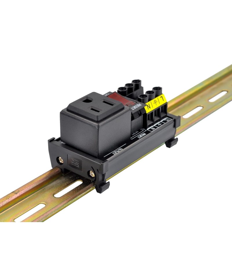 DIN Rail Mount AC 120V NEMA 5-15R Single Receptacle Outlet Power Strip Module, with Rocker Switch Thermal Circuit Breaker Overload Protector. The overload protector has a built-in red indicator light. When the overload protector is working normally, built-in indicator light is on and the receptacle output is normal. When the overload protector is disconnected due to overcurrent, built-in indicator light goes out and the live wire of the receptacle is disconnected. After troubleshooting the overload, you can press the overload protector to RESET position to restore its connection. In addition, by pressing overload protector to RESET or OFF position, you can also manually control all receptacles output ON / OFF.