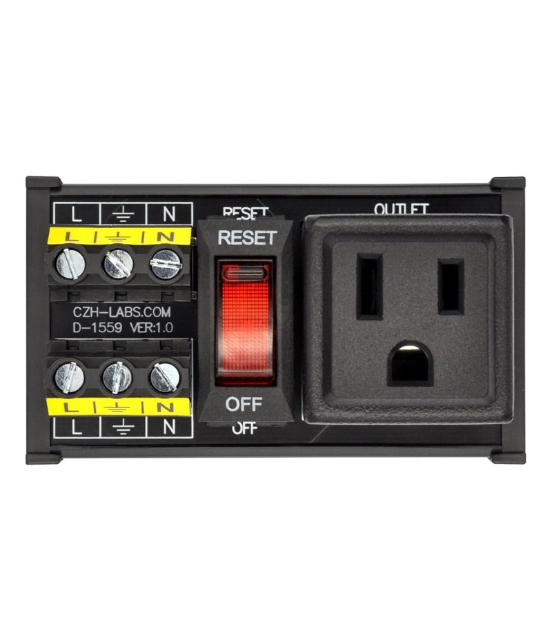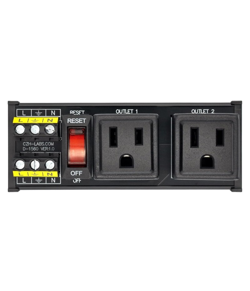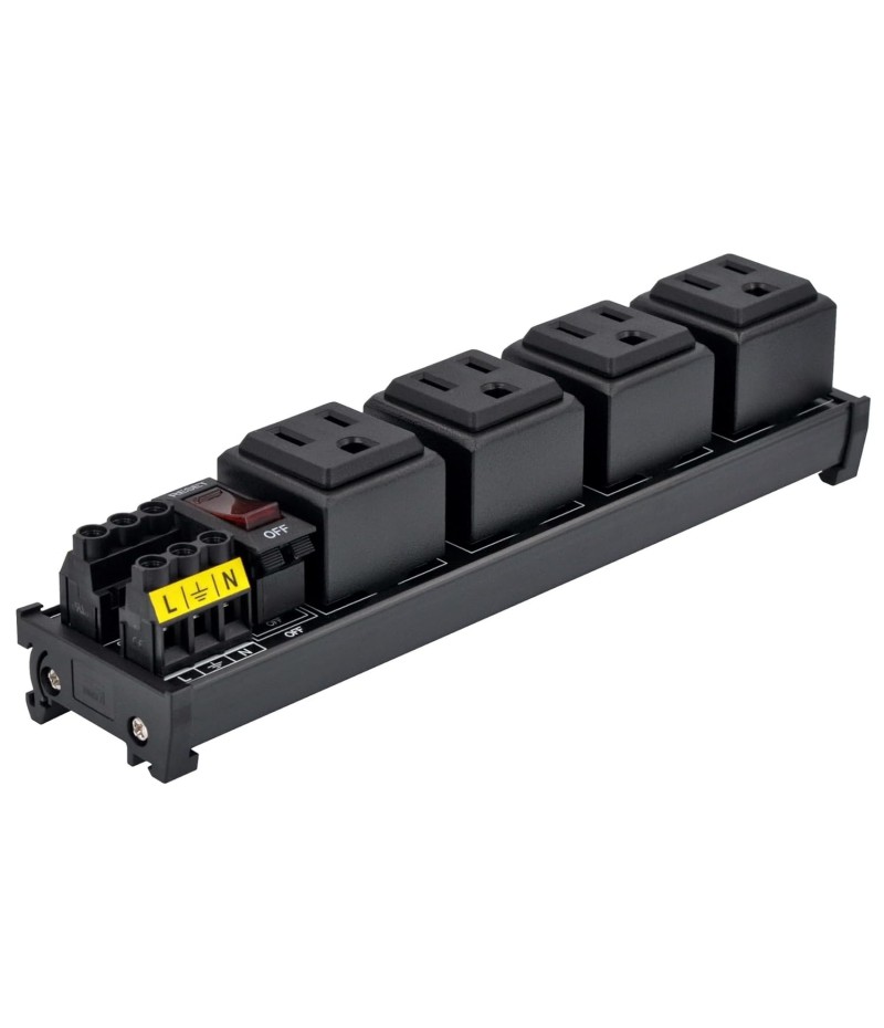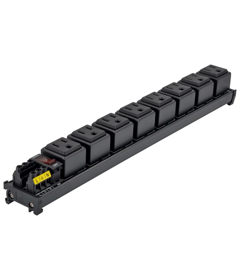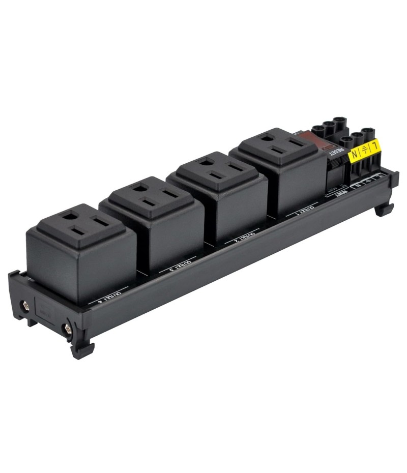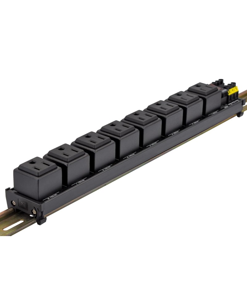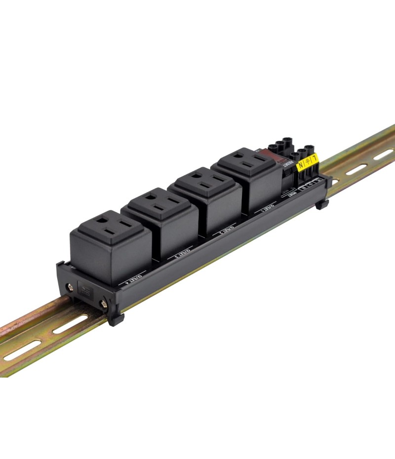 DIN Rail Mount AC 120V NEMA 5-15R Single Receptacle Outlet Power Strip Module, with Rocker Switch Thermal Circuit Breaker Overload Protector. The overload protector has a built-in red indicator light. When the overload protector is working normally, built-in indicator light is on and the receptacle output is normal. When the overload protector is disconnected due to overcurrent, built-in indicator light goes out and the live wire of the receptacle is disconnected. After troubleshooting the overload, you can press the overload protector to RESET position to restore its connection. In addition, by pressing overload protector to RESET or OFF position, you can also manually control all receptacles output ON / OFF.