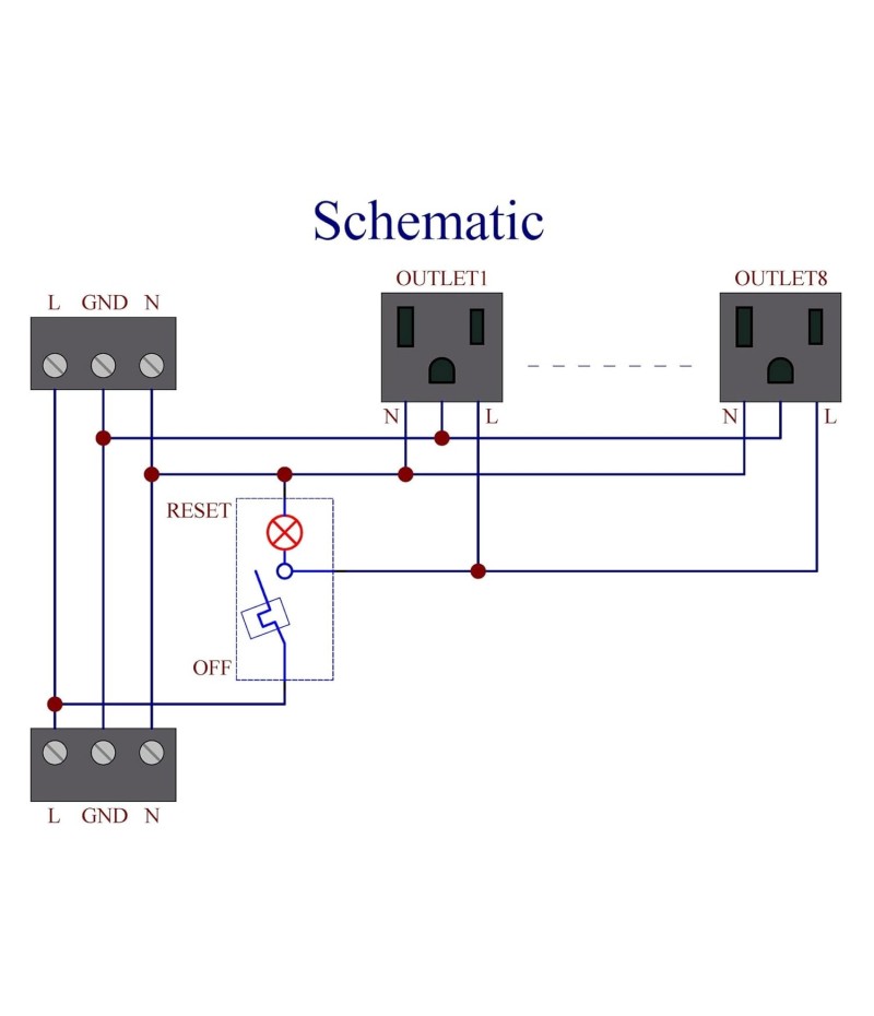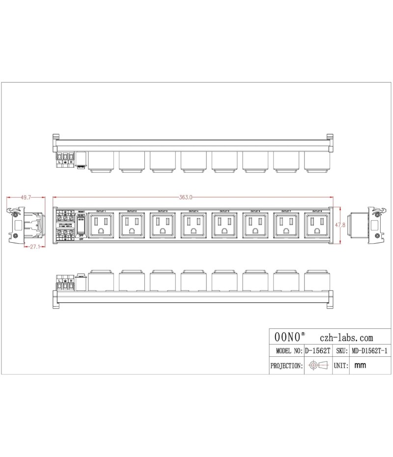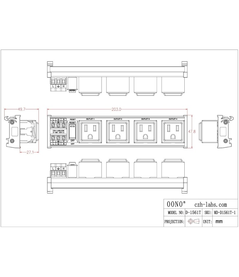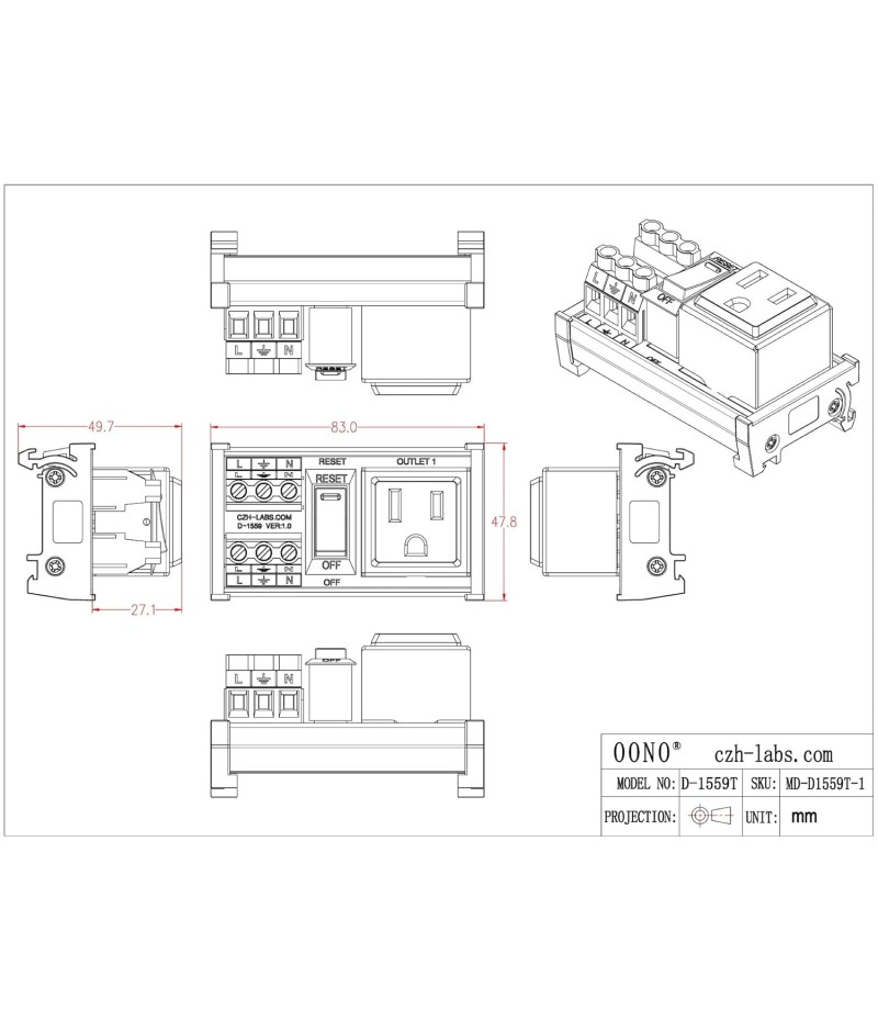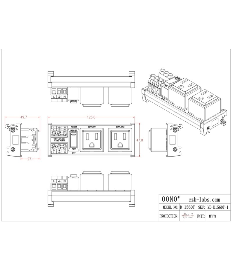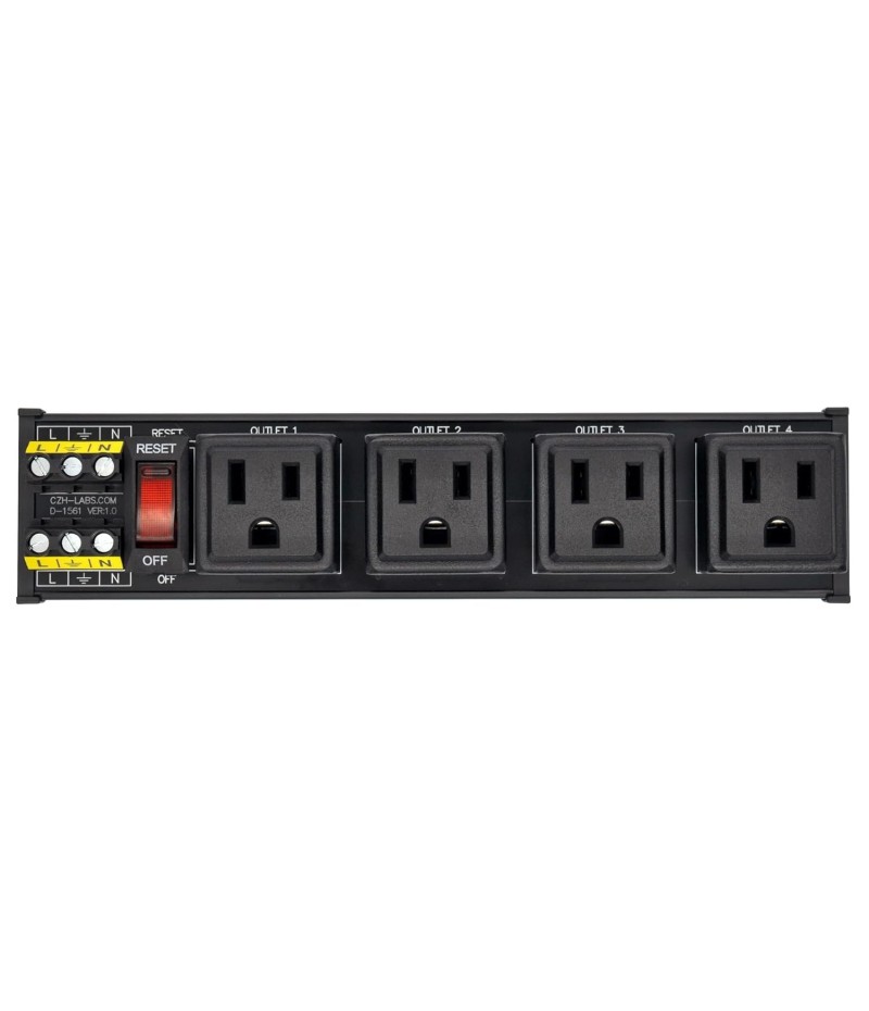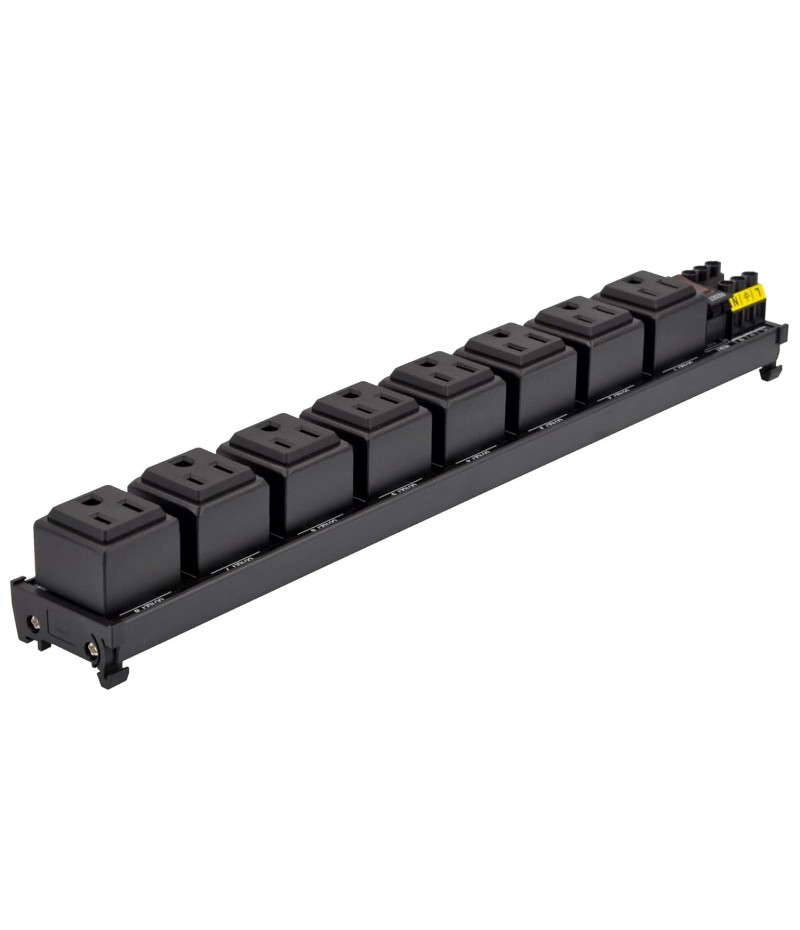 DIN Rail Mount AC 120V NEMA 5-15R Single Receptacle Outlet Power Strip Module, with Rocker Switch Thermal Circuit Breaker Overload Protector. The overload protector has a built-in red indicator light. When the overload protector is working normally, built-in indicator light is on and the receptacle output is normal. When the overload protector is disconnected due to overcurrent, built-in indicator light goes out and the live wire of the receptacle is disconnected. After troubleshooting the overload, you can press the overload protector to RESET position to restore its connection. In addition, by pressing overload protector to RESET or OFF position, you can also manually control all receptacles output ON / OFF.