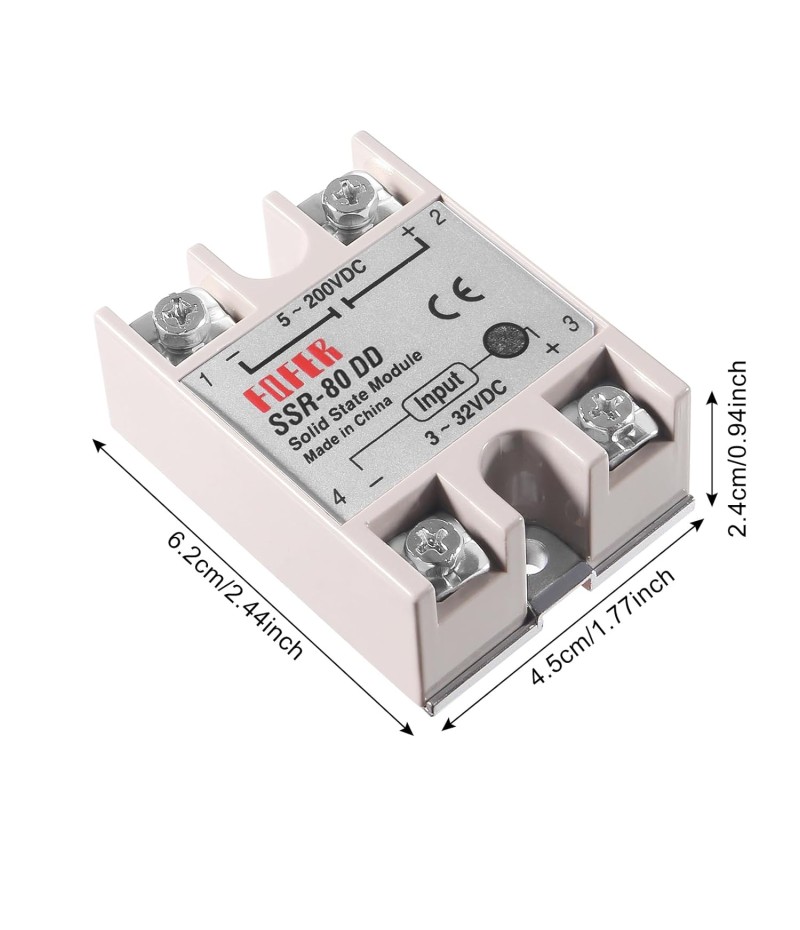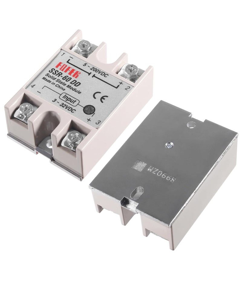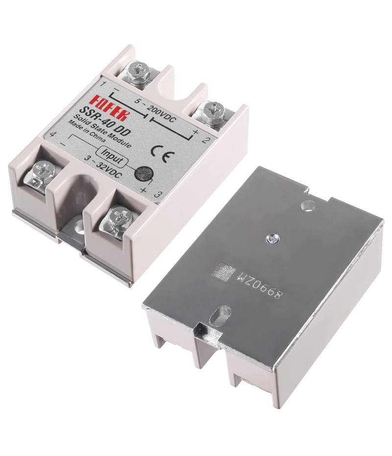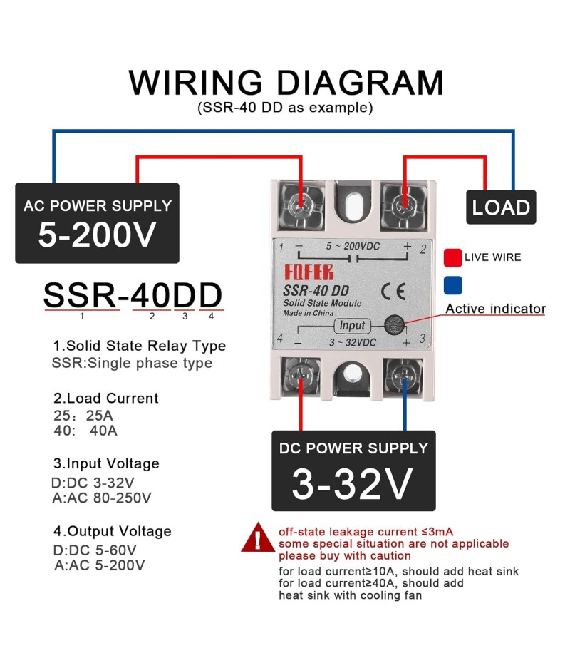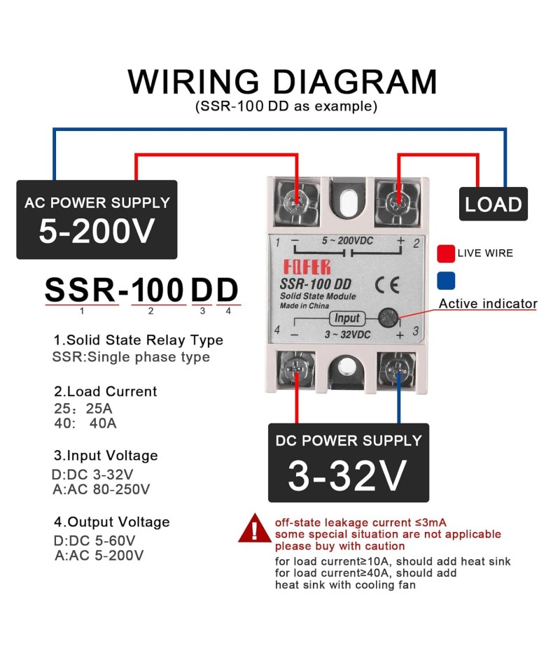 • 【Note】: The solid-state relay generates a lot of heat. When the load current is greater than 10A, it needs to be used with a radiator. Apply thermal grease between the solid-state relay base plate and the radiator, and the fan is forced to cool if it is above 60A.
